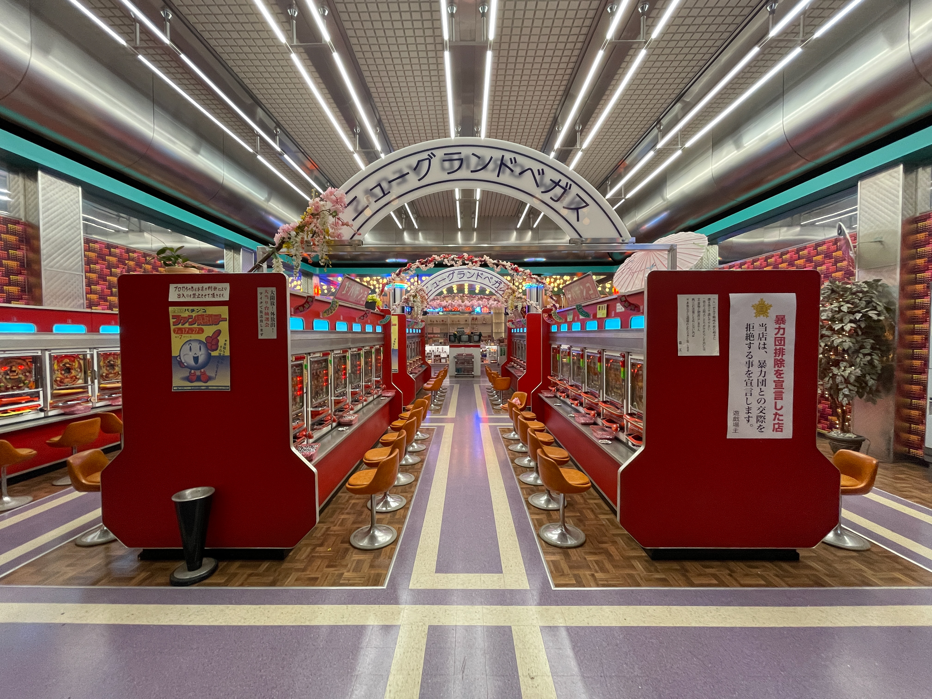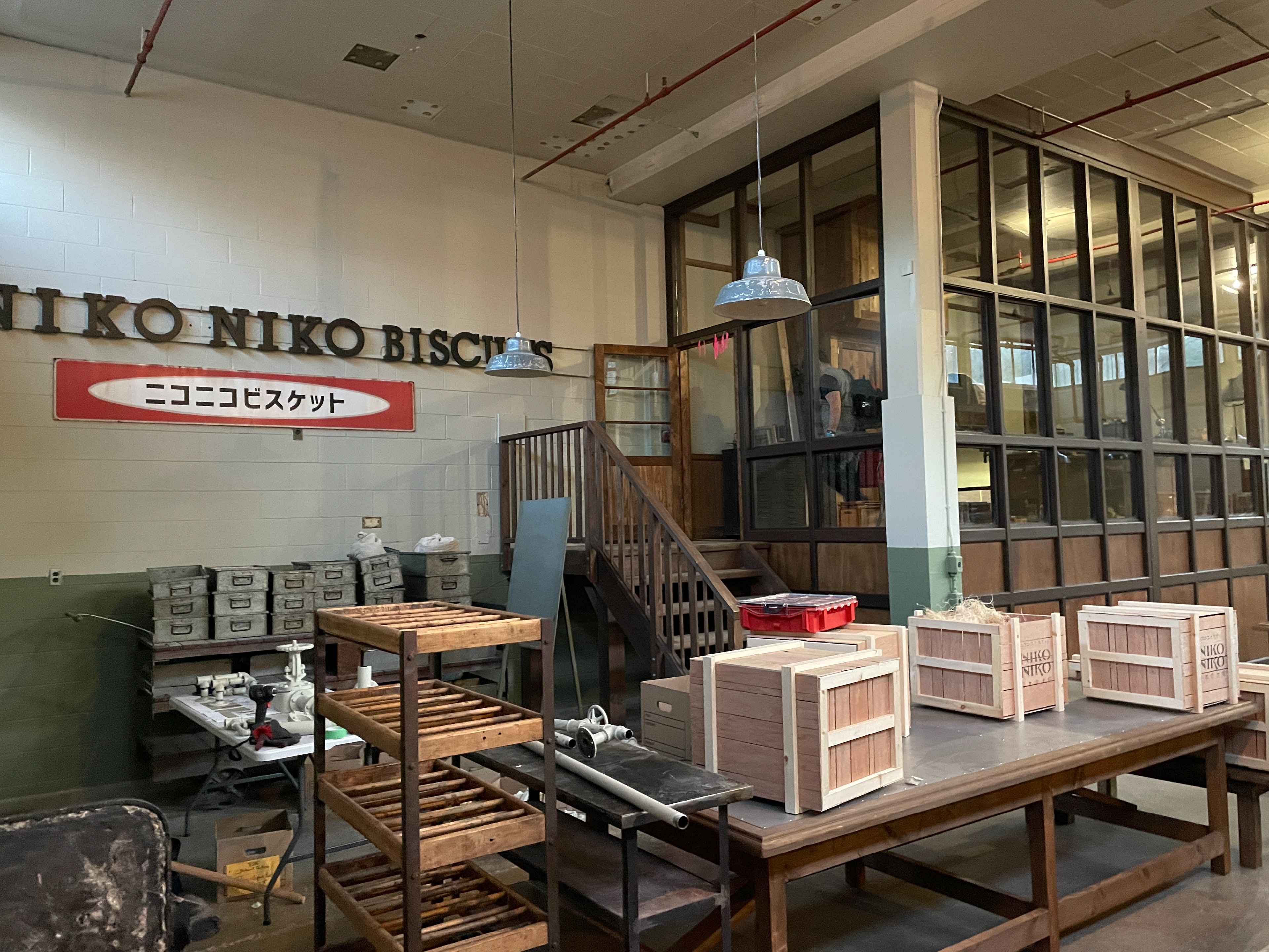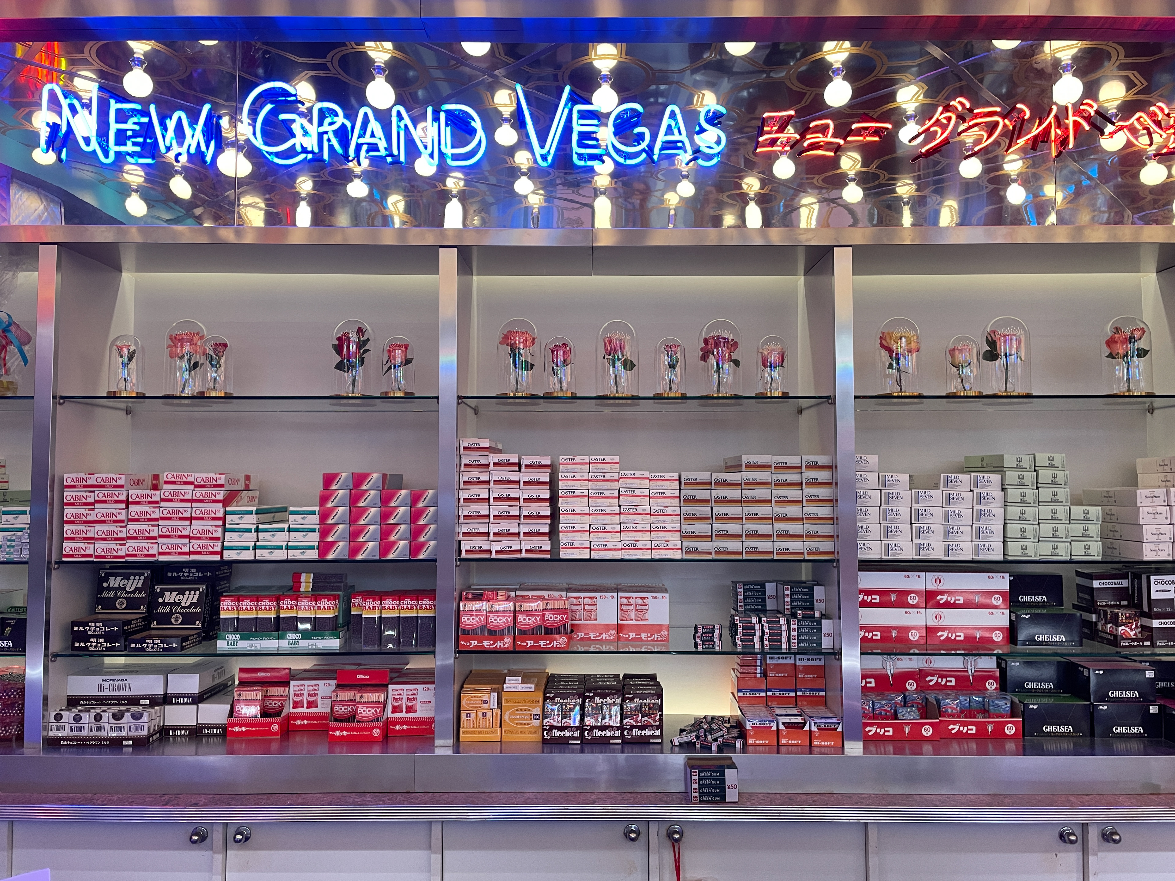 Plexi signage and neon signage, posters, window frosting, banners, backdrop, and endless period correct Japanese cigarettes and snack packaging